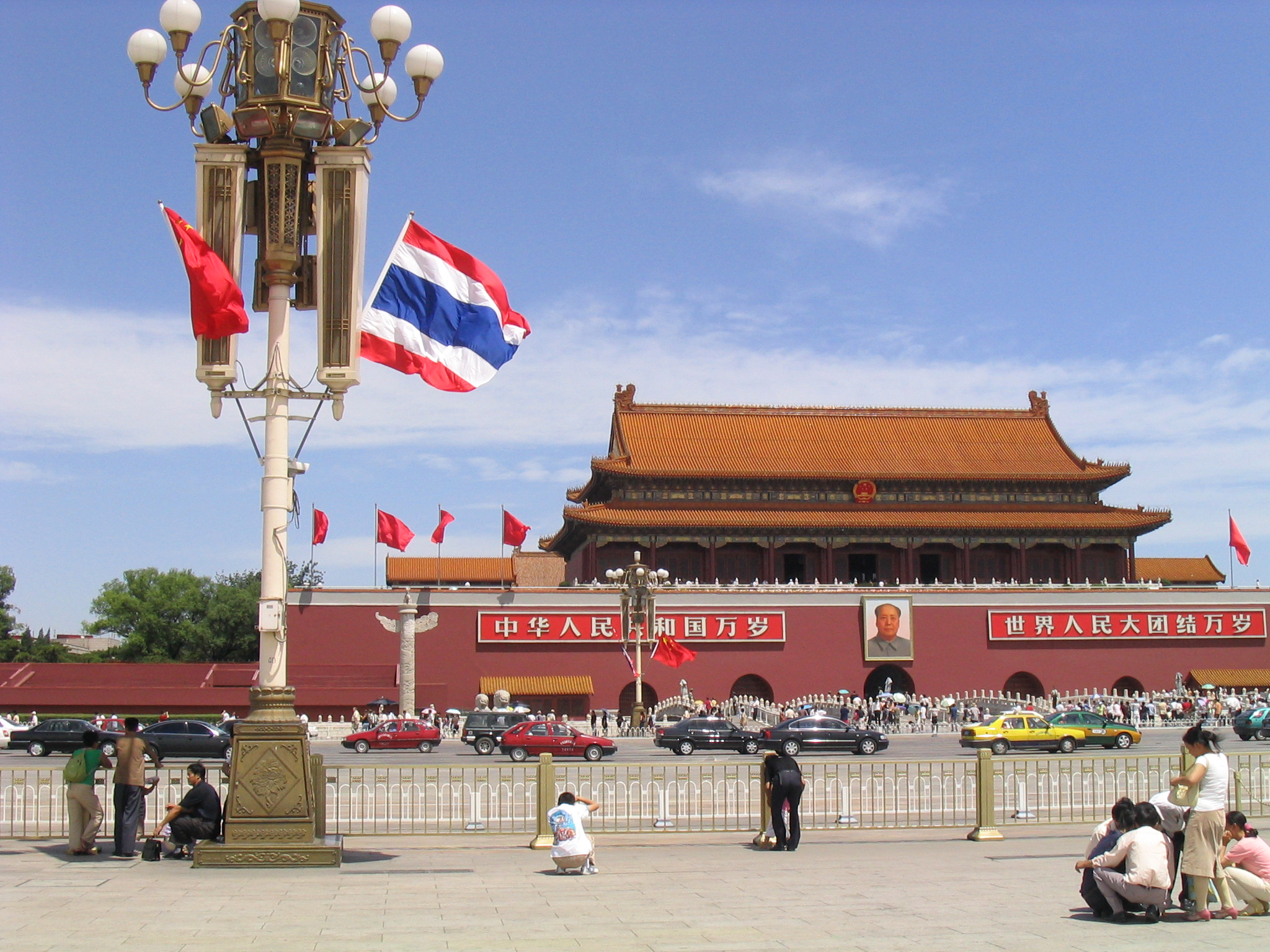 ภาพนี้ถ่ายเอาไว้เมื่อวันที่ ๑ กรกฎาคม ๒๕๔๘ เป็นภาพธงไตรรงค์ประดับคู่อยู่กับธงชาติจีนที่จตุรัสเทียนอันเหมิน กรุงปักกิ่ง